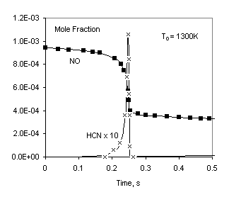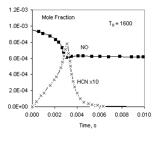 Parameters of this problem are similar to that studied in [2]. We don’t concern about the main subject of the work [2] (creating a reduced reaction mechanism for NO emission) and take only the numerical data for NO reburning. A fixed pressure problem is solved.